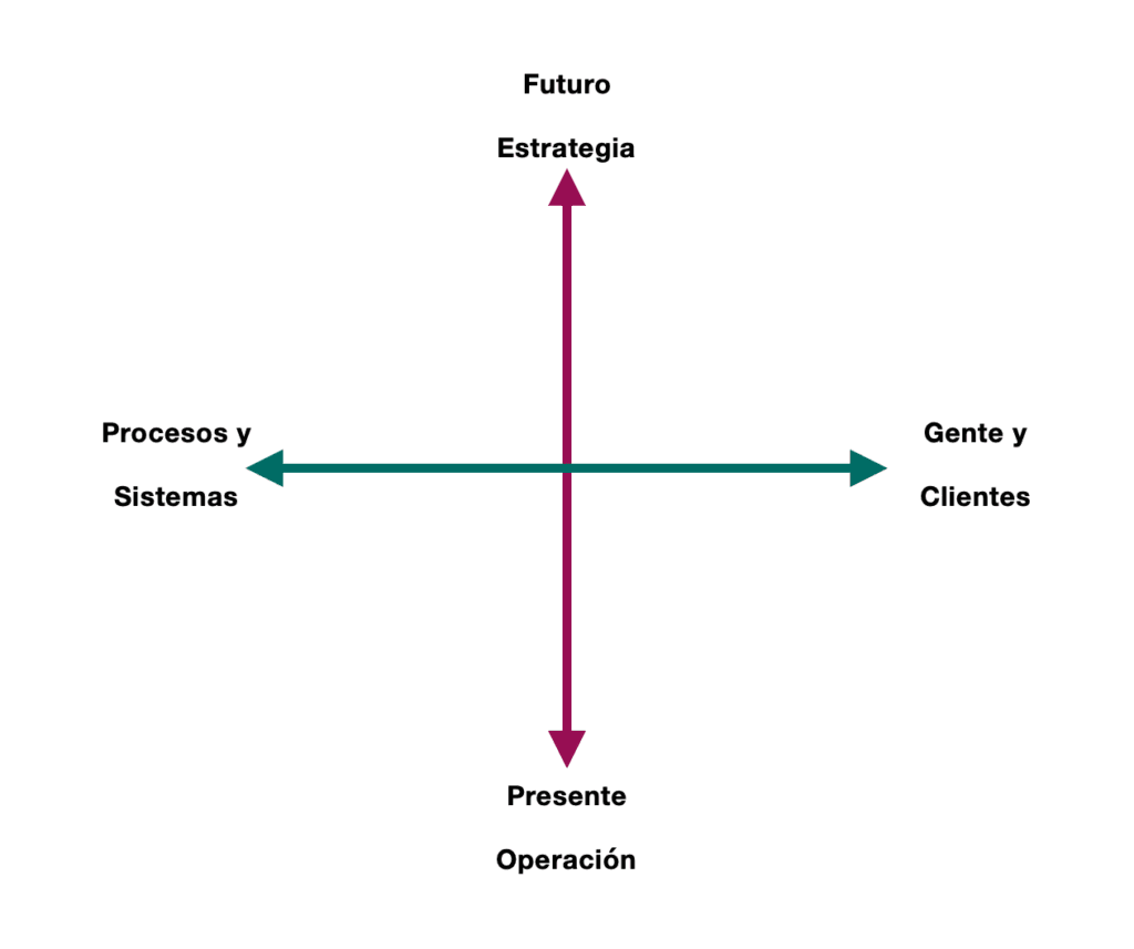 Una vez que has construido el modelo estratégico con sus dos ejes; vertical que conecta el tiempo futuro: la estrategia, dirección de lo que quieres lograr; con el presente: con lo que tienes que trabajar y hacer ahora.